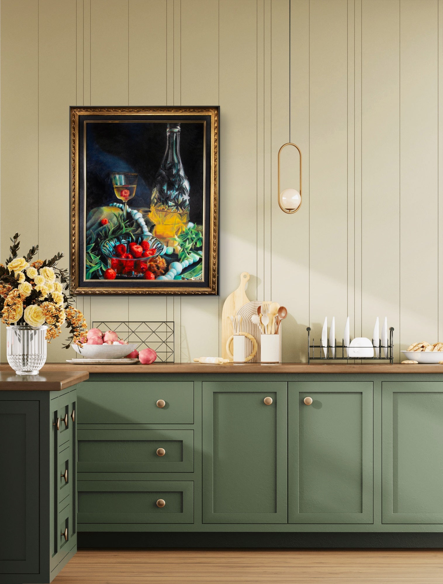 This piece show luxurious afternoon refreshments of raspberries and a spritzer.