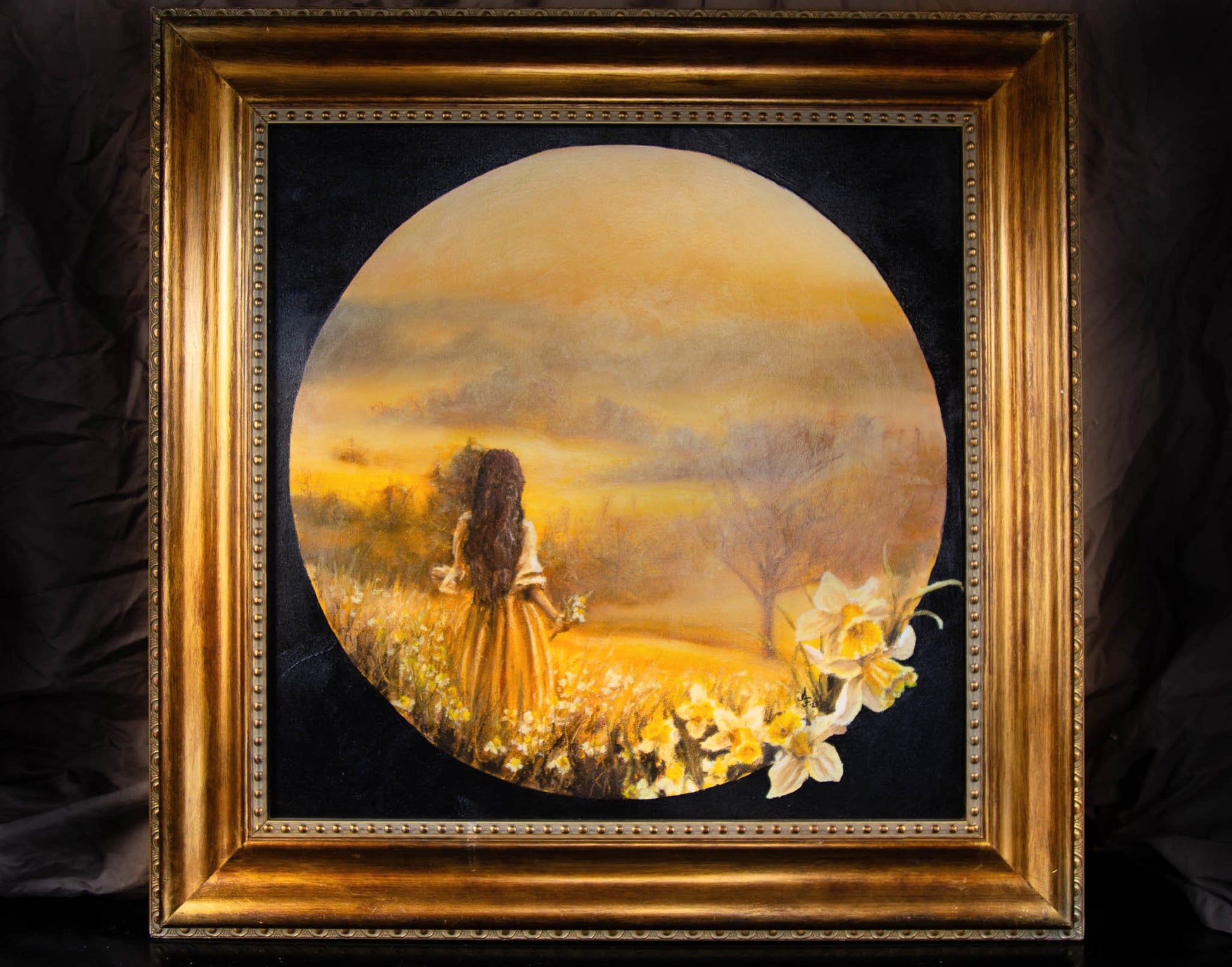 It is early spring, the landscape remains predominately brown as splashes of color begin emerge on the sun kissed hillsides. A young woman goes out to pick them on a cool morning. A mist is rising to meet the clouds as the sun warms the frozen land. She stares into the fog, waiting for the sun to unravel the mystery of the land. Her future is uncertain, but hope of clearer vision is on the horizon. The lady of the Daffodils pauses in contemplation, flowers in hand. For whom does she gather them? Personal enjoyment.