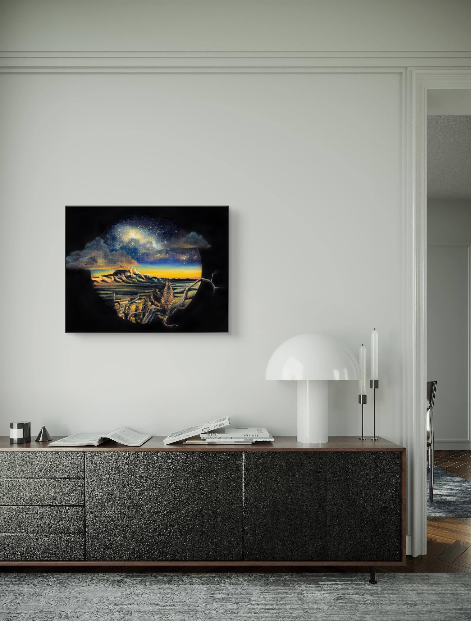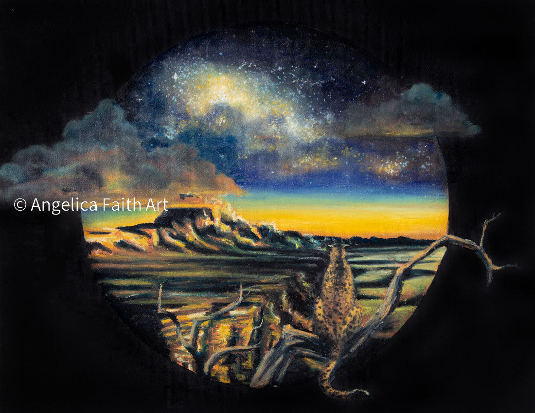 When I was getting married to my husband, the night before I was nervous about how my life would change. As we settled into the cabin we were staying in that night, one of my bridesmaids noticed and she took me outside and told me that whenever she felt afraid of what lies ahead and could not settle her mind, she would go out and look into the night sky at the twinkling stars. All the anxiety from the day would fade away into the stillness of the night. So when I drew my subject as a leopard, my colors as black and yellow, and calm all out of a jar, I wondered how I would make a leopard calm also how that would work with black and yellow, that is often a warning in nature. But then I was inspired by the night sky in the North American desert just as the sun sets and I knew I had to paint that. As I made this piece, it reminded me so much of the night before my wedding with my dear friend. To this I day, years into a happy marriage I never regret, I still do this and remember my dear friend. As I painted this piece, it reminded me of that special moment with the leopard stares calmly into the sky, almost sighing as it sits perched on its branch. The perfect way to end a day.